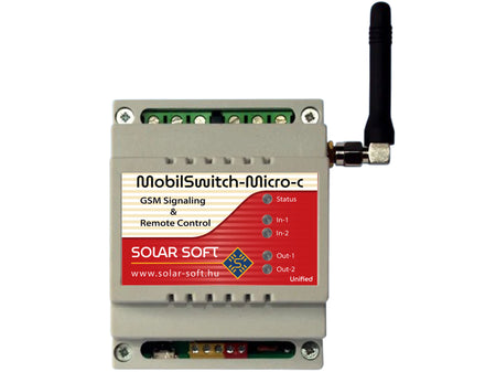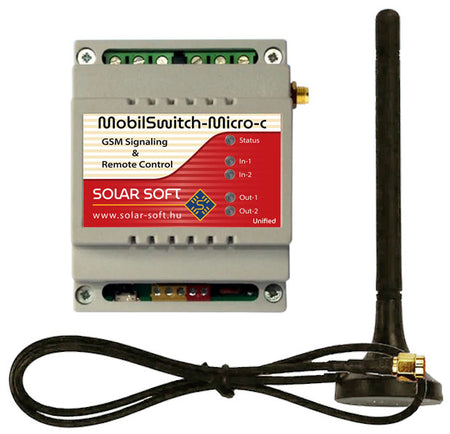 A MobilSwitch-Micro-C GSM távjelző és távkapcsoló modul szolgáltató független ipari GSM modullal, PIN-kód nélküli előfizetéses vagy feltöltős nanoSIM kártyával működik. Univerzális távjelző és távkapcsoló modulok, melyek a MobilSwitch készülék család középső tagjai. Egyszerűbb típusai a MobilSwitch-Nano készülékek általános felhasználásra, nagyáramú kapcsoltatásra a MobilSwitch-Nano-C szolgál. A modul DIN sines dobozba beépített derékszögű bot antennás változatban vásárolható meg. Minden készüléknél az antenna és a letöltő szoftverünk tartozék. Az antenna a vásárláskor a készülék dobozában megtalálható, a Unified névre hallgató univerzális letöltő szoftver a https://solar-soft.hu/letoltesek menüpontban érhető el.
