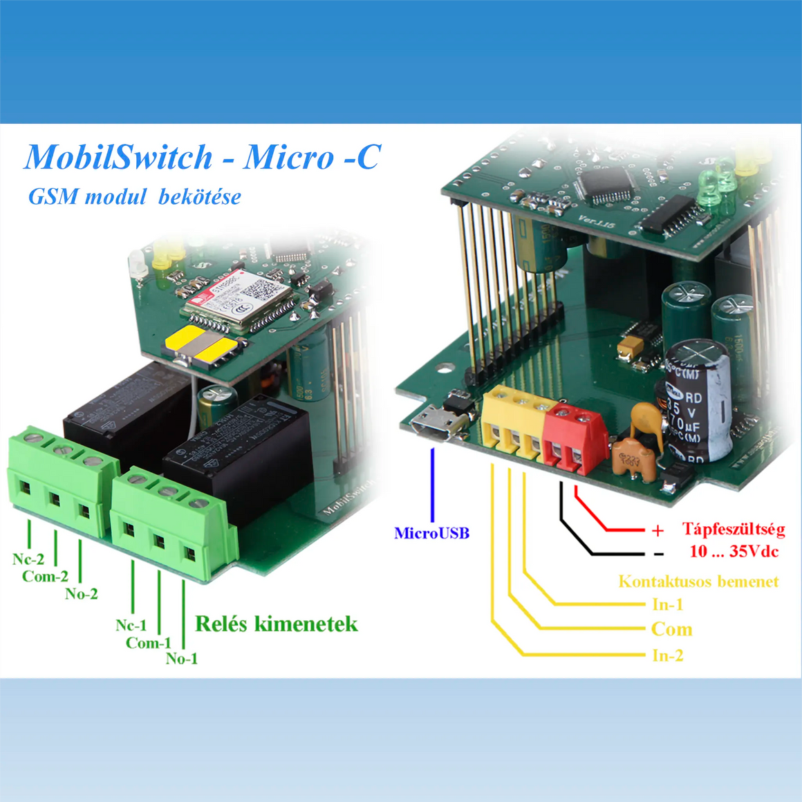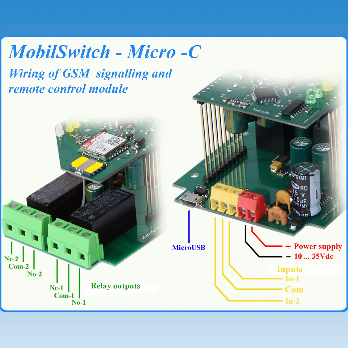A MobilSwitch-Micro-C távjelzésre és távműködtetésre fejlesztett DIN sines, nagyáramú relé kimenetes GSM távjelző és távkapcsolómodul, a MobilSwitch-2c korszerűbb utód terméke. A 2 bemenete feszültségmentes kontaktusra aktiválódik, és két egyáramkörös nagyáramú relés kimenete van, melyek terhelhetősége 230V-on max. 6A. Saját szoftverével a Unified letöltővel laptopról vagy asztali számítógépről programozható. A modul a felhasználót a bemenetek változásairól az általa programozott SMS-ben és ráhívással értesíti. Opcionálisan beállítható nyugtázás funkciója van. A felhasználó által programozott tartalmú SMS-sel, vagy a hívószám felismerésen alapuló ingyenes rácsengetéssel a relék távkapcsolhatók. Két üzemmódja van, az egyik a monosatbil állapot (kapcsoltatás után valamennyi idő elteltével automatikusan kikapcsol) a másik a relék bistabil állapota (amikor a bekapcsolást és kikapcsolást külön paranccsal kell végeztetni). A MobilSwitch-Micro-C max. 8 telefonszámra programozható. Tápfeszültsége ipari tartományú, 10-35V egyenfeszültség minimum 500mA terhelhetőséggel.