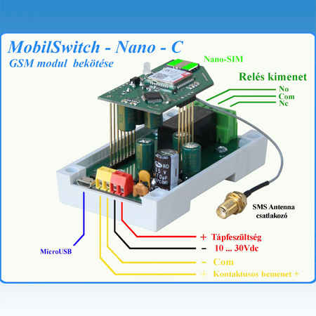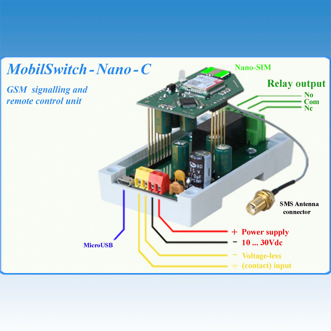A MobilSwitch-Nano-C általános célú ipari felhasználásra, távjelzésre és távkapcsolásra fejlesztett GSM hívó modul, a MobilSwitch-2c GSM hívó korszerűbb utód terméke. Bemenete feszültségmentes kontaktusra aktiválódik, és nagyfeszültségű és nagyáramú relés kimenete van. Saját szoftverével laptopról vagy asztali számítógépről programozható, letölthető, kiolvasható. A modul a bemenetek megváltozásáról a felhasználót az általa tetszőleges tartalomra előre programozott SMS-ben értesíti. Ezenkívül egy-egy (felhasználó által programozott tartalmú) SMS-sel, vagy a hívószám felismerésen alapuló ingyenes rácsengetéssel a nagyfeszültségű és nagyáramú relés kimenet (230V 6A) állapota változtatható. Univerzális használatra javasolt ipari GSM pager max. 4 telefonszámra programozható fel, így egy-egy SMS is max. 4 telefonra küldhető el. Sokoldalú felhasználásra tervezett, biztos működésű készülék, mely jó ár-érték arányú GSM távjelző és távirányító egységként univerzális felhasználásra, távjelzésre és távkapcsolásra ad lehetőséget. Ipari célzatú készülék, tápfeszültség igénye 8-35V egyenfeszültség, min. 500mA terhelhetőséggel.