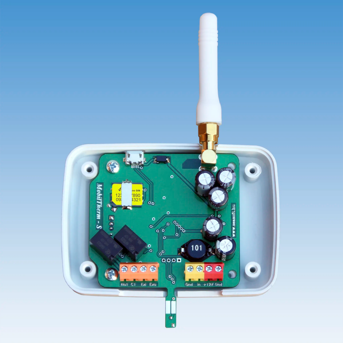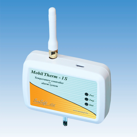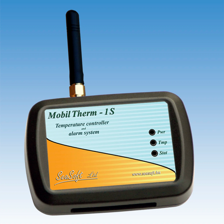 A MobilTherm-1S általános célú távhőmérésre, távjelzésre és távműködtetésre kifejlesztett ipari GSM alapú hőfokjelző és hőfokriasztó modul. A GSM termosztát és hőfokriasztó modulnak belső vagy külső digitális hőmérője, kisáramú, egyáramkörös relés szabályzó kimenete van. A modulhoz csatlakoztatható digitális hőmérő -50C és +50C fok között mér. A beállított alsó és felső hőmérsékleti határokat átlépve a modul a felprogramozott felhasználói telefonszámokra SMS-t küld. A digitális bemenet változásairól is küld SMS-t. A felhasználók a riasztásról előre beállított tartalmú SMS-ben és telefonhívással értesülnek. A MobilTherm-1 GSM thermosztát max. 4 telefonszámra programozható fel. Szabályzandó, temperálandó hűtőterek, hűtőkamrák, fűtőszárító terek, raktárak és temperált mezőgazdasági vagy állattenyésztési létesítmények számára javasolt, de gépjárművek és lakóautók esetén is használható. Tápfeszültsége 10-30Vdc egyen, min. 500mA terhelhetőséggel. .