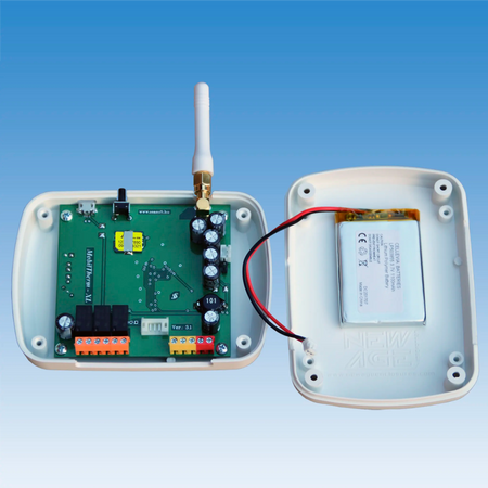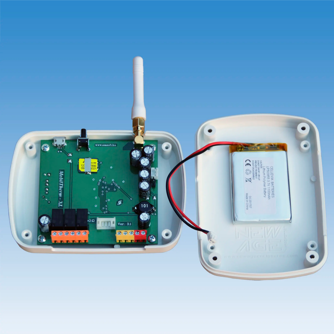 Dobozolt kivitel belső Li-Po akkumulátorral, fűtés funkció, 2 kontaktusos bemenet, 1+2 relés kimenet, digitális hőmérő, hívás és sms riasztás, PC-ről USB-n programozható, belső ráépített antenna, belső digitális hőmérő, akkumulátor.