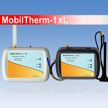 A MobilTherm-1xL hőfokszabályzásra, távhőmérésre, távjelzésre és távműködtetésre kifejlesztett ipari GSM alapú thermosztát, hőfokjelző és hőfokriasztó modul. A GSM modul belső Lythium-polimer akkumulátorral, külső digitális hőmérővel, 2 db záró kontaktusra aktiválódó bemenettel és 2 db egyáramkörös, kisáramú relés kimenettel rendelkezik. Relés kimenetei egy-egy SMS-sel kapcsoltathatók ki- és be bistabil (csak újabb SMS-re változó) állapotba, vagy monostabil állapotba, azaz egy parancs SMS hatására adott időre meghúzattathatók, mely idő leteltekor a relék automatikusan kikapcsolnak. A modulhoz csatlakoztatható digitális hőmérő -50C és +50C fok között tud mérni. A beállított alsó és felső hőmérsékleti határokat átlépve a modul a felprogramozott felhasználói telefonszámokra SMS-t fog küldeni. A két digitális bemenet változásairól szintén küld SMS-t. A felhasználók a hőmérsékleti riasztásról vagy bemenet változásokról előre beállított tartalmú SMS-ben és/vagy telefonhívással értesülnek. A relék No kimenete van kivezetve, így a fogyasztók alapállapotban kikapcsoltak. A relé meghúzásával azok bekapcsolhatók.